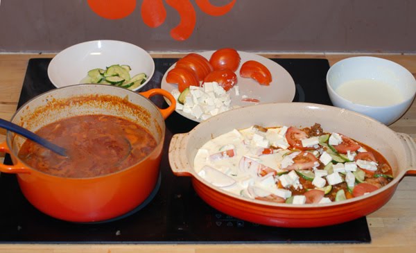 Smør formen med litt olivenolje. Sett sammen lasagnen lagvis, start med plater, så kjøttsaus, så tomater, squash, fetaost og så litt av den hvite sausen. Gjenta, og avslutt med et lag saus. Strø Jarlsbergen over til slutt, stek i ovn på 200 g. i 20 min. la stå i 10 min før servering.
